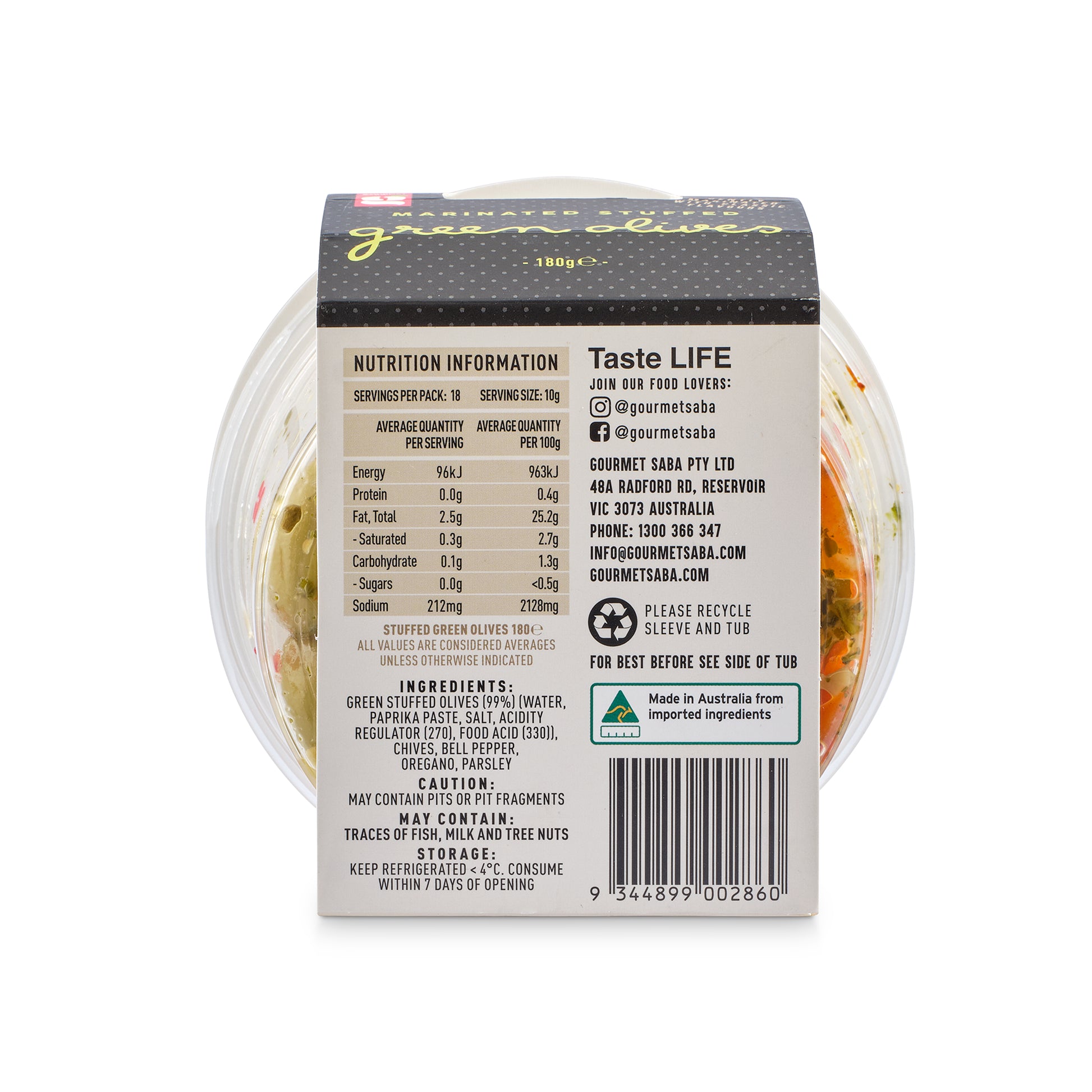 | Our sun ripened green olives, gently filled with paprika paste and marinated. |